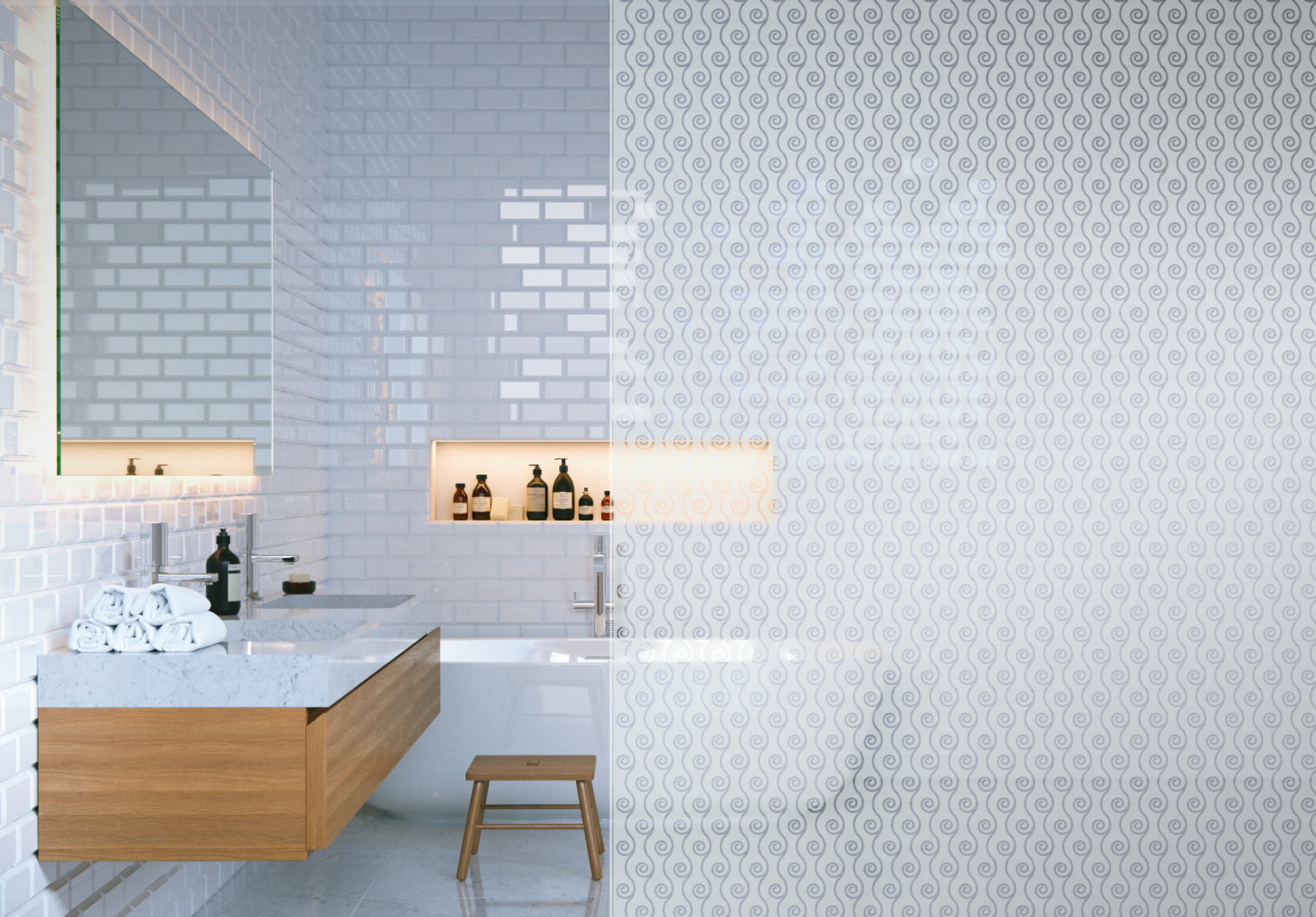 Konturgeschnittene Sandstrahlfolie mit seidenmatter, transparenter Oberfläche für die Verklebung auf Glas – vermittelt den Eindruck einer sandgestrahlten Oberfläche. Wird auch als Glasdekorfolie oder Satinatorfolie bezeichnet.